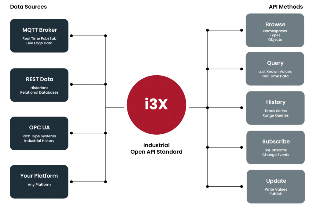 Genau hier setzt i3X an: Es fungiert als einheitliche API-Schicht zwischen Datenplattformen und Applikationen, sodass alle Systeme ihre Daten auf die gleiche Weise bereitstellen können – unabhängig von Anbieter, Format oder Technologie.