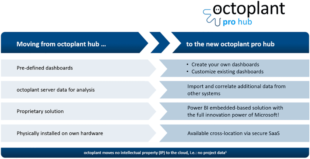 Faites l’expérience d’un reporting précis des données, parfaitement adapté à vos KPI ! Avec octoplant pro hub, vous pouvez désormais combiner de manière transparente vos données octoplant avec des informations provenant d’autres systèmes, tout en profitant d’une évaluation détaillée du processus de sauvegarde et de versionnement. Vous obtenez ainsi un aperçu et une transparence encore plus complets de tous vos processus de production et installations. Mais ce n’est pas tout – la solution SaaS rend la Business Intelligence accessible et facile à utiliser pour tous les utilisateurs.
