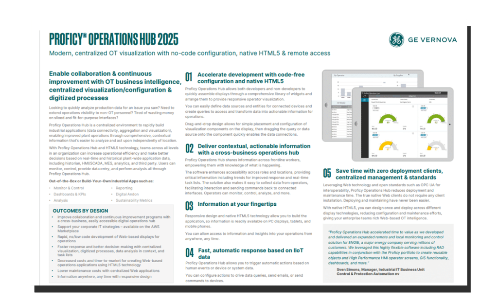 Proficy Operations Hub is GE Vernova’s web-based operations intelligence workspace that brings data, visualisation, and industrial apps together in a single, role-based view. It lets teams connect to Proficy and third-party data sources, build thin-client dashboards without coding, and give everyone from operators to managers a live, plant-wide perspective.