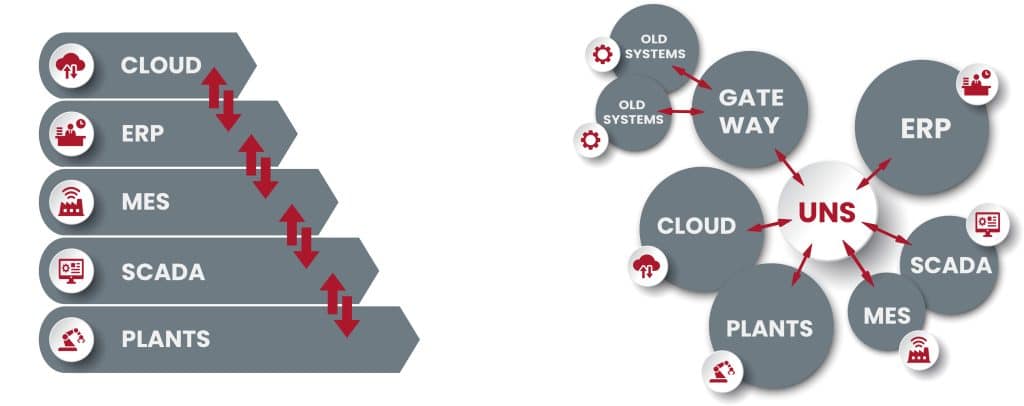 Klassische Architektur vs. Unified Namespace (Hub-and-Spoke)