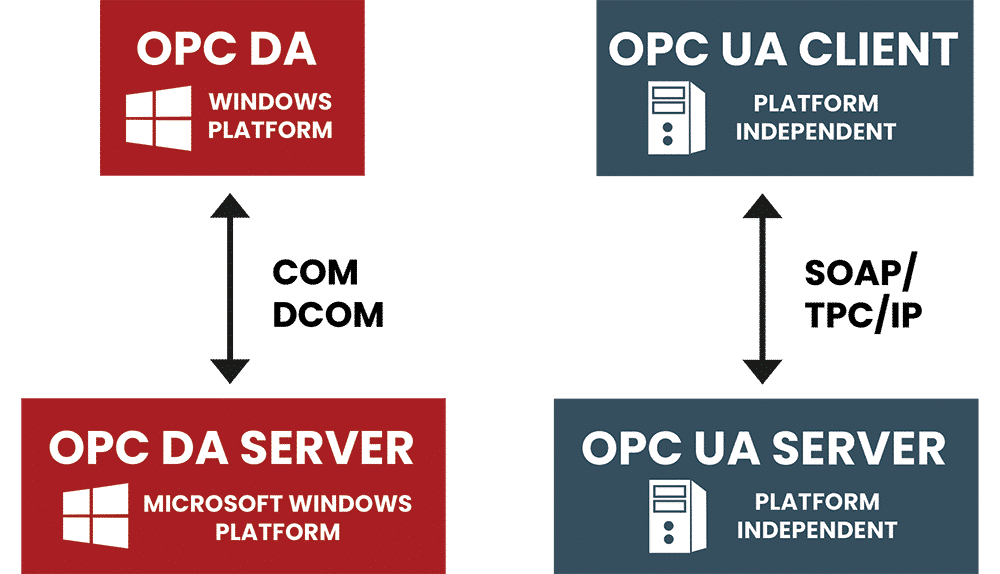 Wir unterscheiden heute zwischen zwei verschiedenen OPC-Standards. Die klassischen Standards heissen OPC DA (Data Access), OPC A&E (Alarm & Events) und OPC HDA (Historical Data Access). Diese Standards basieren auf COM/DCOM und sind somit auf Windows-Betriebssysteme beschränkt.