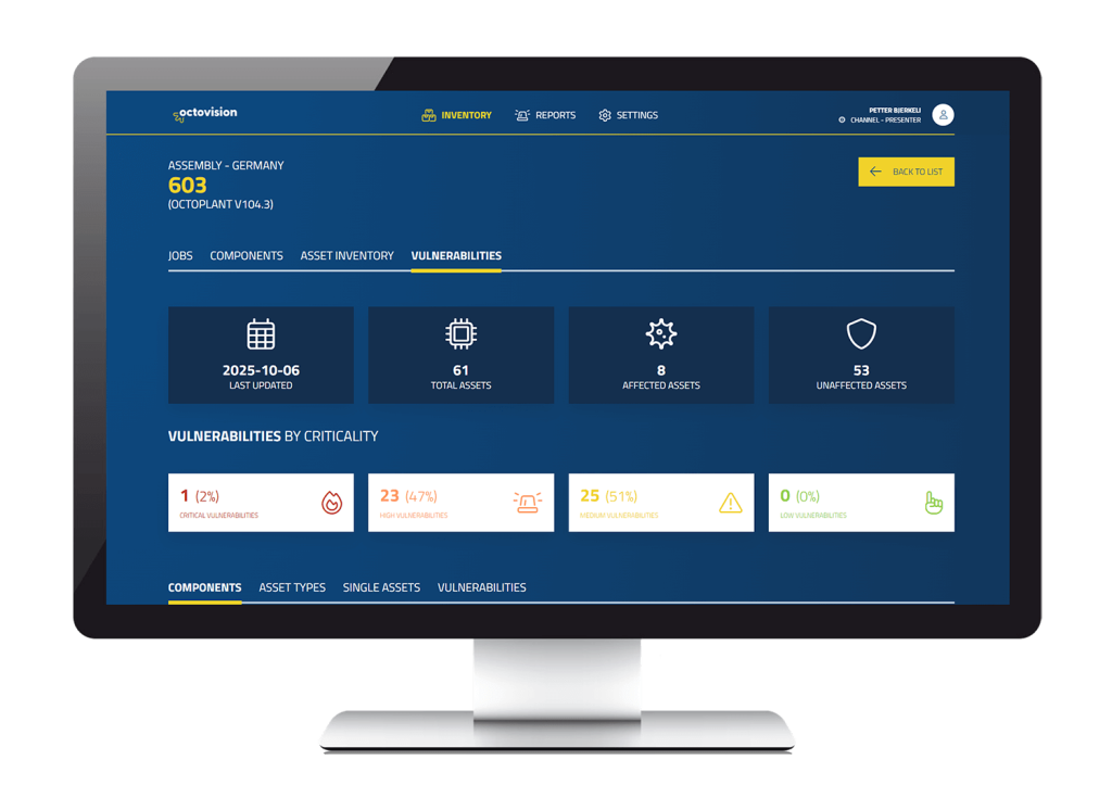 Octoplant understøtter proaktiv risikostyring ved at koble konfigurationsdata til kendte sårbarheder (CVE’er) og fremhæve potentielle risici i dit produktionsmiljø.