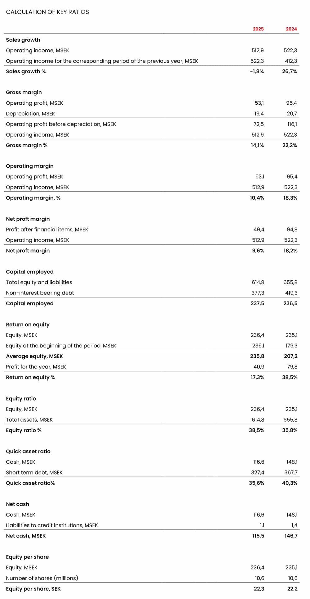 The table presents alternative performance measures, which complement the metrics that are either defined or specified in the applicable financial reporting standards under IFRS. Of the above key figures, only Earnings per Share is mandatory and defined according to IFRS. Novotek considers the other non-IFRS performance measures to be relevant for users of the financial reports, as a supplement for assessing and evaluating Novotek’s performance. Since not all companies calculate financial metrics in the same way, these measures are not always comparable with those of other companies. The definition, and in some relevant cases a description, of financial measures not defined by IFRS are provided below. The performance measures (Sales Growth, Gross Margin, Operating Margin, and Profit Margin) are key components in monitoring the Group’s value creation.
