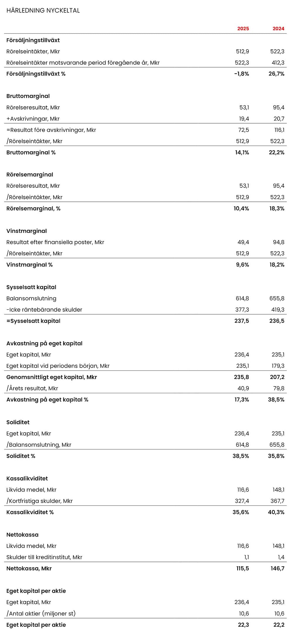 I uppställningen bredvid finns alternativa nyckeltal angivna, vilka kompletterar de mått som antingen definieras eller specificeras i tillämpliga regler för finansiell rapportering av IFRS. Av ovanstående nyckeltal är det endast nyckeltalet Resultat per aktie som är obligatoriskt och definierat enligt IFRS. Övriga icke-IFRS resultatmått anser Novotek vara relevanta för användarna av de finansiella rapporterna som ett komplement för att bedöma och utvärdera Novoteks prestation. Eftersom inte alla företag beräknar finansiella mått på samma sätt, är dessa inte alltid jämförbara med andra företags finansiella mått. Definitionen, samt i vissa lämpliga fall beskrivning, av finansiella mått som inte definieras av IFRS framgår nedan. Resultatmåtten (Försäljningstillväxt, Bruttomarginal, Rörelsemarginal samt Vinstmarginal) är nyckelkomponenter för att följa koncernens värdeskapande.